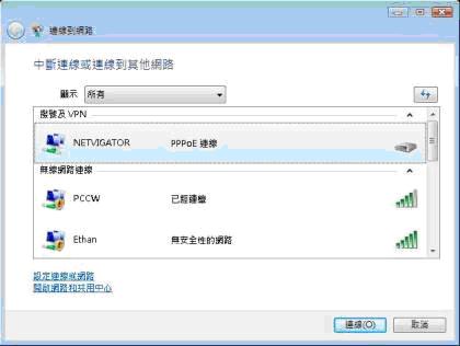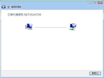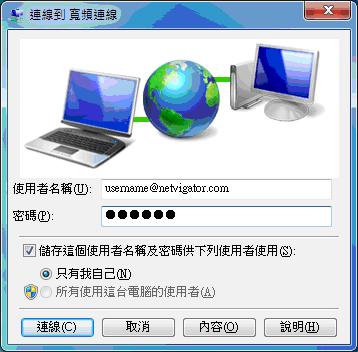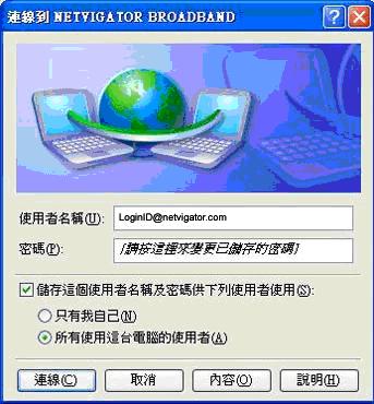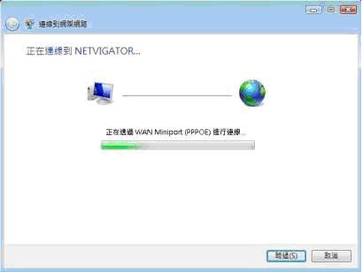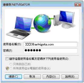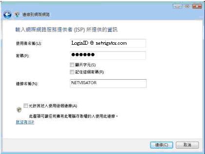 12. 電腦會顯示一個"連線到 NETVIGATOR BROADBAND"視窗, 按"連線"來連接上網