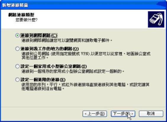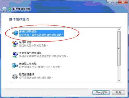 6. 選擇第一個選項"連線到網際網路"再按"下一步"