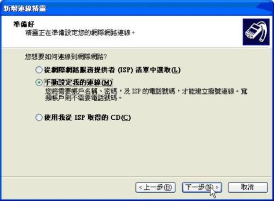 7. 選擇第二個選項"手動設定我的連線"再按"下一步"