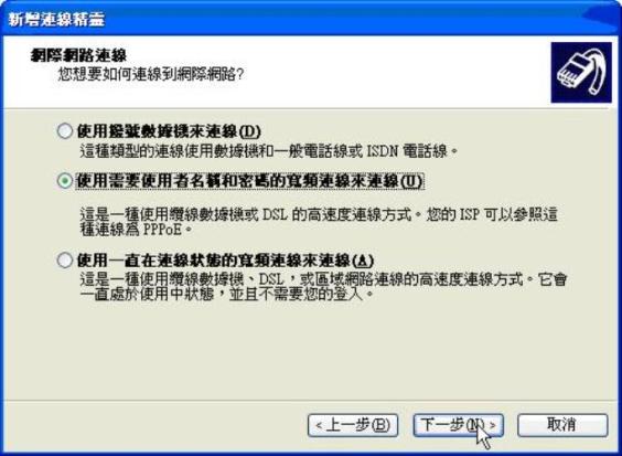 8. 選擇第二個選項"使用需要使用者名稱和密碼的寬頻連線來連線"再按"下一步"
