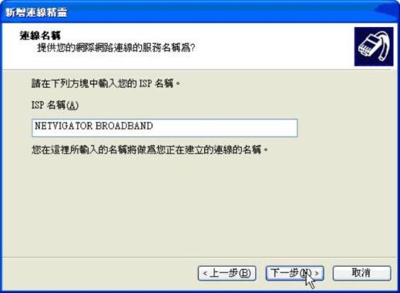 9. 在"ISP 名稱"欄裡輸入"NETVIGATOR BROADBAND", 然後按"下一步"