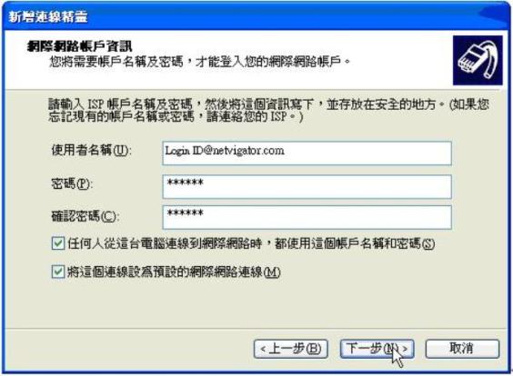 10. 輸入使用者名稱" (i.e. "loginID@netvigator.com")及密碼,在"確認密碼"欄再次輸入密碼,然後按"下一步"