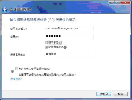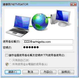 5. 輸入 “使用者名稱” 和 “密碼” 及將 “連線名稱”命名為 NETVIGATOR後按 “連線”